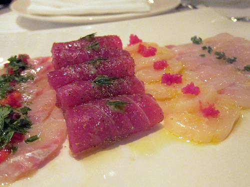 If I had known Milos did such a fantastic sashimi plate, I would have eschewed Blue Ribbon the night before. Our server advised us to save the scallops for last. He was right. The sweet, rich scallops were like dessert. The tuna though was really amazing. I never think much of regular tuna but this dish was a stunner. I could have ordered the large plate and been happy. We shared the small version which is good for two people.