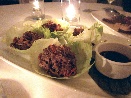 I have always thought lettuce cups were a fun thing to eat. They’re like the original low-carb treat from the Chinese. With a ropa vieja (confit) of duck legs, the meat was then slid into perfectly trimmed and chilled lettuce cups. There was almost too much meat to make a neat package but the best part about eating with your hands is licking the sauce off. Okay, did I really do that?