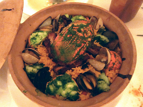 We decided on one main and one side. The spiny lobster is the thing to get and there are several options for it. We decided to wait for the green seafood and yellow rice Chinese clay pot featuring the spiny lobster along with a medly of jumbo shrimp, calamari, clams and mussels. Hello tasty friends.