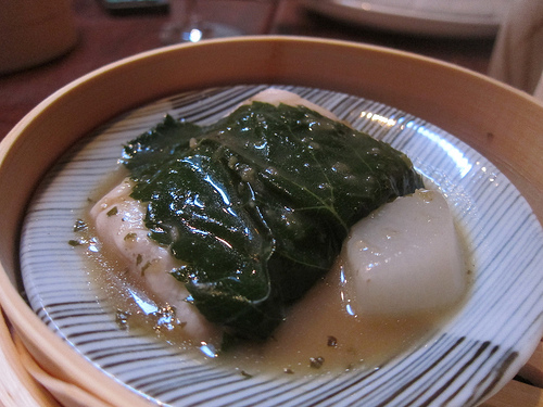 I didn’t know you could eat cherry tree leaves until this night. Since I love grape leaves, I thought the texture of the sakura leaves were similar, though a bit sturdier. This Sakura leaf steamed black cod was not just a pretty presentation, it was completely edible. If you like stronger fish like mackerel, give this cod dish a try. It had a similar pungency.