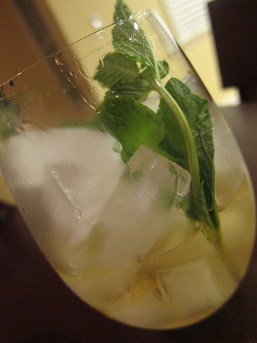 Whenever I get invited to dinner parties, I tend to bring the booze and take it upon myself to make drinks. In the last few years, my “bartending” skills have gotten better as I’ve gotten more interested in craft cocktails. I had wanted to make beer cocktails, punch and bring a dessert wine for an intimate dinner last week with a few friends. It didn’t quite go as planned. I gathered up an arsenal of supplies (mostly unopened bottles I had) and then bought a bottle of rum along with some fresh produce.What amused me the most was probably my “six-pack” which I dubbed the Minty six-pack; two bottles of Deschutes Mirror Pond pale ale and Deschutes Black Butte porter along with a couple of mini sparkling wines.