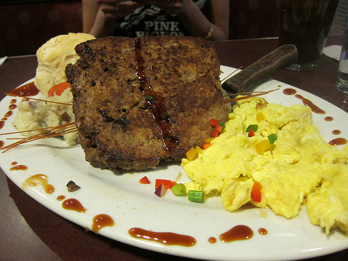 I had asked for a medium rare burger but obviously this was medium well. Still, the abundance of cheese and mushrooms kept it interesting. Oddly, there were also droplets of teriyaki sauce around the plate. The same teriyaki sauce was served with the meatloaf and eggs.