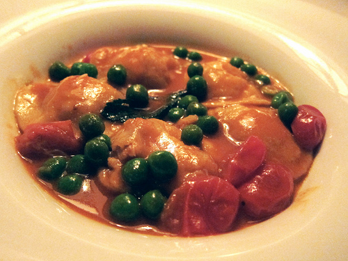 But my favorite pasta this evening was the crab ravioli with English peas and mint. I would be quite happy to have just ordered this and a salad. Well, and maybe some of those wonderful cicceti we had earlier- particularly the fava bean and burrata bruschetta.