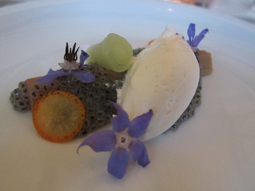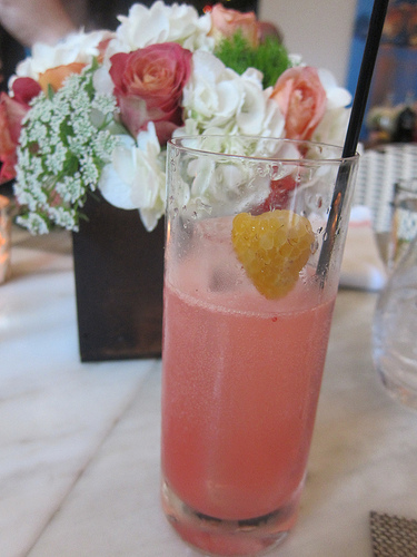 First we had the Mandarin Fizz (Nolet’s Silver Dry Gin, lemon, mandarin tangerine, egg white, simple syrup, orange bitters) which was a nice, light drink to go with Chef Ray’s amuse of things he found at the Farmers’ Market that day.