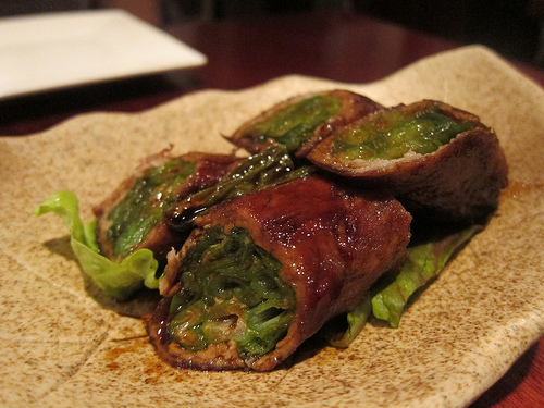 On my first night in New York City, we had dinner at Mishima. I had been up practically all night and day and it had been a long travel day. While sushi didn’t particularly sound comforting, I was craving sashimi. We started off with the negi maki appetizer which is beef wrapped around green onions. It’s very Atkins-friendly (well, minus the sauce perhaps).