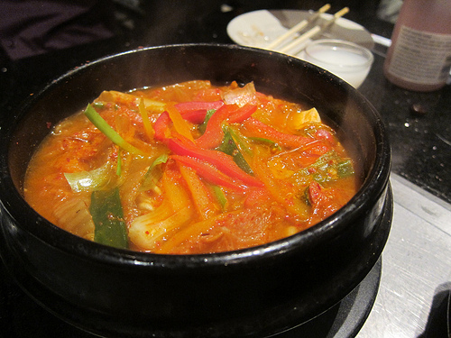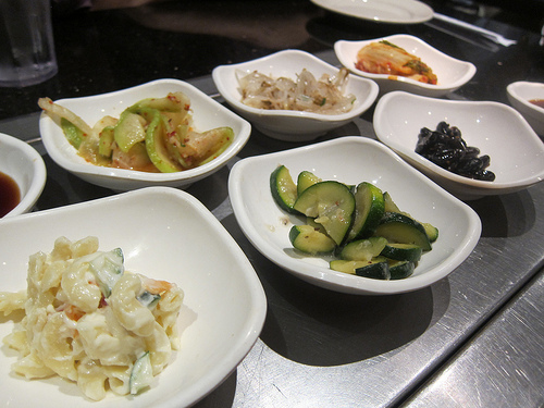 But we were not seeking the companionship of giggling girls and over priced fruit platters. I was determined to find a good spot. I passed a few possibilities and ended up at Shilla because friends were tired and this large restaurant (it has 3 floors!) could seat us immediately. The banchan arrived. I noticed the Korean-speaking tables got extra fish. I would be mad at Shilla but maybe they’ve encountered to many non-Koreans who won’t eat the whole-fried fish. On the other hand, they did ignore me when I asked for more kimchi. And the time we waited to order and to get the check could be construed as bad service. I just chalk it up to typical Asian joint lassitude.