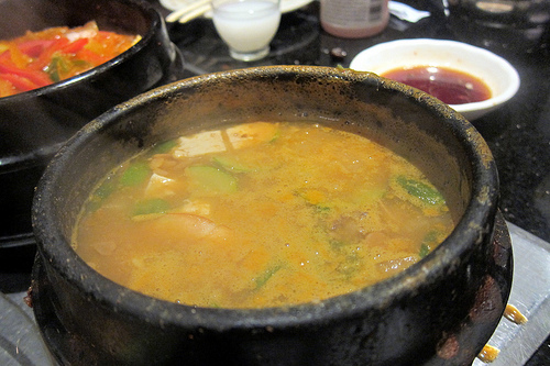 We shared the fermented bean paste soup with seafood. I probably should have tried to show the seafood which consisted of a lone shrimp and a clam or two. It was mostly tofu. It went well with plain white rice. It’s a thinner soup so good thing I was getting full from the dumplings and noodles.