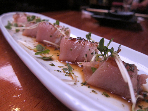 Our chef asked if we were still hungry. Yes and no. Yes because I wanted to try some more but I was getting somewhat full. He gave us the seared albacore with garlic. I didn’t quite like this as much. While I did like the garlic, it was very powerful.