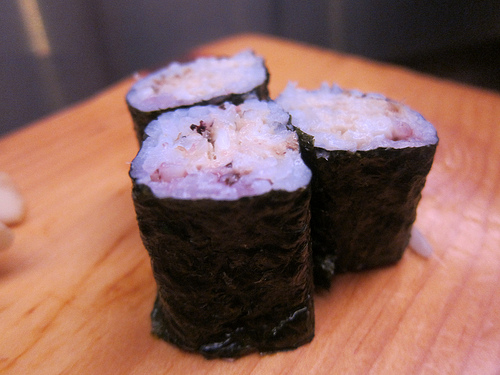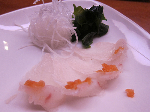Next we had sea bream sashimi with a bit of roe and seaweed. The fish was very delicate, a good way to begin a sushi meal.