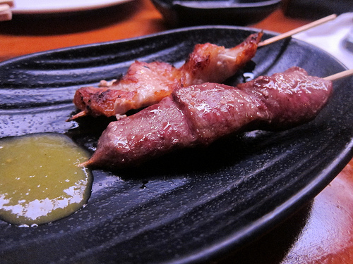 Then he grinned and gave us skewered pork cheek and beef tongue that had been grilled. The magical green sauce was very addicting. I couldn’t decide if I liked the pork cheek or the beef tongue more. The tongue had the texture of heart– toothsome but not chewy.