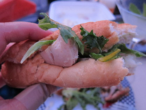 At some point, it was getting dim and I wanted to hurry our meal along so I came up with a sandwich. Our basket included really great rolls so I stuffed them with the chicken and salad. It made the perfect sub to nosh on in the growing darkness.