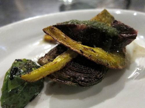 During my last SF trip, the Opportunarian fell back to her mostly vegetarian ways. She did make an except for raw fish and so Mr. Pollo gave her slightly different courses than Carina and I. She started with raw salmon while we had it seared.