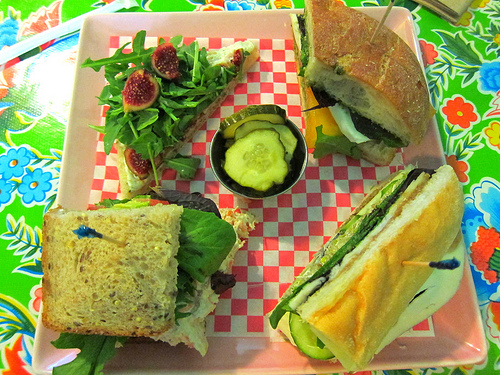 I checked out the sandwiches for lunch. I got a sampler of four sandwiches including the tuna salad, Morbay cheese and a couple of specials- an heirloom tomato caprese and an open-faced fig, bleu cheese and bacon number that I’ll have to try to recreate one day for a picnic with a lover. It’s one of those decadent sandwiches you’d want to feed to someone while dreamily reciting poetry sitting under a huge tree with no one else around. Except the ducks swimming in the pond, of course.