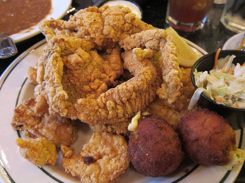 But I had to contend with the folly of what I did. My plate of fried seafood was really amazing. I started slowly. I enjoyed a nibble of the hushpuppies, paid some attention to my cole slaw but I knew I’d had to get in on the fried oysters, shrimp, fish, scallops and whole freakin’ soft shell crab soon. I had a little bit of everything and my favorites were the oysters, fish and and shrimp. I wish I was eating this right now as I write this. I was VERY fond of that fried seafood. Again, not greasy and perfectly fried. The South sure does know how to fry.