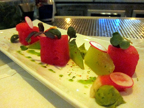Meanwhile, the kitchen sent out a dessert of compressed melons, whipped avocado and pickled rinds. We welcomed the breezy fun treat.