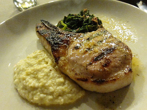 I had debated getting Willard’s brick chicken but I’m much more a steak or pork person. After listening to the description of the butcher’s steak which was a hanger steak that comes pre-sliced, I opted for the hog chop. You can’t tell really from the photo but it’s a massive chop. It was juicy and I really liked the white cheddar grits and mustard greens as well.