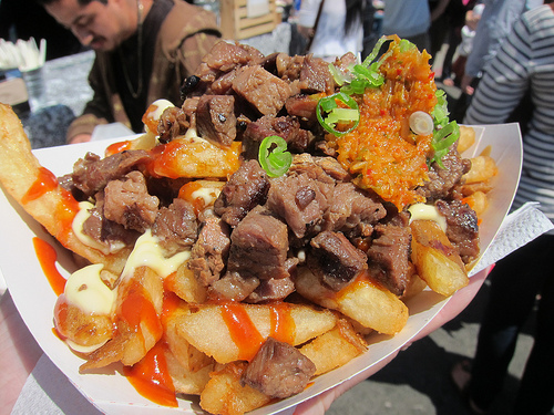 When I saw the gamja fries, I knew they’d go perfectly with the pork lao burger I ordered from 4505 Meats next stall over. Kimchi on anything is good. You got to pick which meat to top it with so I went with bulgogi (beef). It’s like Korean disco fries.