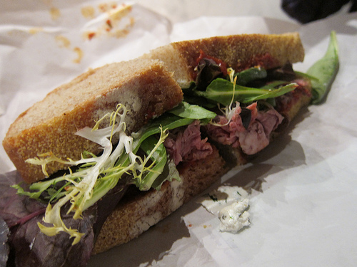 My friend Nick of TreasureMA fared much better than I did. He picked out the lamb sandwich which I had actually eyed but I tend to get different things if someone else really wants it (first rule of food writers- never order the same order). With fresh lettuce and goat cheese to moisten the sandwich, it was a fine sandwich. An admirable sandwich. A shining beacon compared to… oh what? Oh sorry, I got carried away there. It was a fine sandwich.