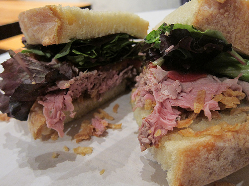The first night I landed in Boston, I had very little time to do more than grab a sandwich before running off to Speed Rack Boston. Although I knew there would be food at Speed Rack, I never know if it’s going to be really heavy appetizers or fight the crowd for a few bites here and there. So I tend to eat before passed appetizer events. As it turned out, they had foie gras from Eastern Standard Kitchen. Oh well! I was full from my roast beef sandwich I got from Flour in Cambridge (Kendall/ MIT). I had asked for no mayo but for some reason, I didn’t get any horseradish either. Overall it was a dry sandwich. If I was thinking clearly (and clearly I was tired from my flight), I would have asked for mustard. Instead, I crammed the whole dry mess with a mess of onion straws down before hitting the town.