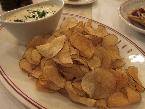 I hadn’t eaten all day and it was nearly 3 PM. Knowing we were about to start a food and booze crawl, I let my bi-polar eating habits shine through. First I ordered a cocktail (duh) and then I got the chips and onion dip to start. A friend got their flatbread to share while I decided to stick to a lady-like salad for lunch.