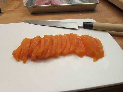 When Yoko revealed the sushi knife, I knew I wanted to cut the fish. I carefully took it out of its box and unwrapped it, testing the weight in my hands. It was so easy and smooth. I blinked and had a massive pile of cut salmon in front of me.