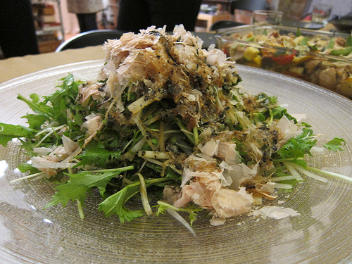 Bonito and seaweed make an appearance in this daikon and greens salad. The daikon is shaved into thin strips and I enjoyed the dressing we made to go with it. You’ll have to attend Yoko’s cooking class to get the recipe but there is ground black sesame involved. And yes, you grind it yourself.
