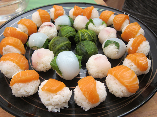 We weren’t making nigiri though. We were making temari, a type of sushi that’s round. First you make your sushi rice by fluffing it out with vinegar. Then we rolled a bit of rice into balls and topped it with your choice of topping. Yoko’s favorite is a preserved vegetable that makes a great vegan treat. Here’s a hint, making the balls with plastic wrap really is much easier (and less sticky!).