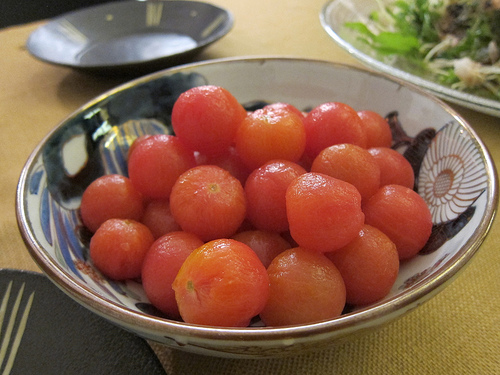 Oh my gosh, look at that huge bag of bonito! We made a dashi broth to marinate the cherry tomatoes.