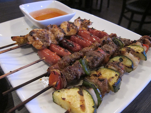 But first we started with the skewers combo. There were veggies, chicken, sausages, shrimp, beef and curry beef. It was actually a lot of food. Maybe we should rethink this bowl of noodles.