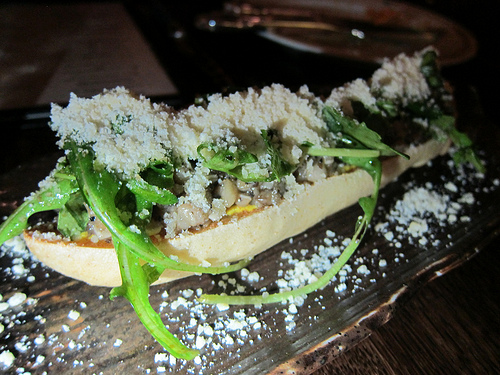 But my favorite dish of the night was the pig ear tartine. It was wholly unexpected looking. I was expecting some sort of layered dish but this looked more like bone marrow (not actually bone) filled with delicious bits of pork, mushroom duxelle and topped with shaved black truffles and Parmesano reggiano. The delivery system to my mouth was a hunk of bread hollowed out to hold pig ear. I’m not much of a bread person but let’s have another baguette!