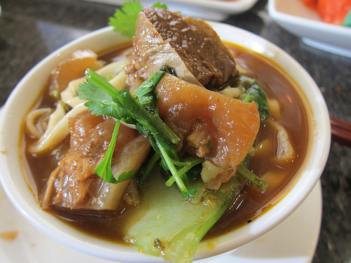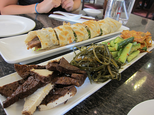 But the taste? Pretty good actually. You don’t lose any flavor in concession to fancy plates. I loved the seaweed salad best but the pig’s ears were great as well. The only disappointment were the odd flavorless tofu. But they were better added to the leftover noodles the next day.