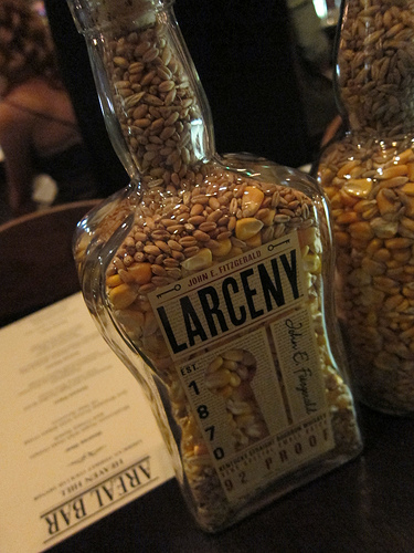 I thought it was really cool Andie brought out bottles showing the mashbills of the spirits. Bourbon by law has to be 51% corn to be called bourbon. Most bourbons are more. As you can see, Larceny is mostly corn with a bit of barley and rye.