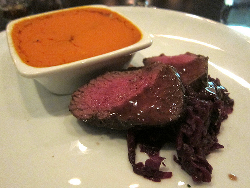 I laugh every time I see whole quails sitting so innocently on a plate waiting to be devoured. But I took my time though carving up the little bird, pausing to take bites from the celery root puree, mixing the near-blood colored gravy in. What a juicy little thing that was.