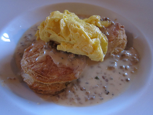 Luckily I got a dish with sausage. Plenty of sausage. I was torn about the chicken and waffles but our server convinced us that the biscuits and sausage gravy was something else. And it was. It also came with two eggs done in any style you wanted. I chose scrambled. And made myself a bit of a biscuit sandwich.