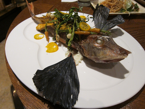 Executive chef Glen Ishii came out with a special treat for us. It was during dineLA and this was one of the entree choices. I had never seen such a spectacularly looking fish. The winged Hobo fish served whole was just so cool to look at. And I loved the itty bitty carrots and radishes. The fish was very tender and flavorful. Chef Glen mentioned he liked cooking this fish so expect to see it on the regular menu.