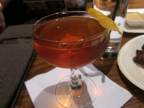 Tyler came over with his version of the Monte Carlo. He likes to use two different kinds of bitters in this classic brown, bitter, stirred cocktail. For this Monte Carlo, Tyler uses the coveted Wild Turkey Rye 101, Benedictine, both orange and Peychaud’s bitters as well as a lemon twist. We talked a bit about our favorite Manhattan variations and agreed how much we loved Red Hooks and Green Points. Of course I like Monte Carlos as well.