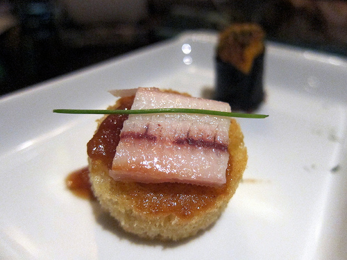 We started with an amuse bouche. A little FG (c’mon, you can figure it out- damn California) never hurt anyone (a little! Not a lot!). It was topped with smoked eel. The combination was a little Asian, a little French. But we also got this great lamb heart tartare topped with uni and I liked the fresh wasabi in it.