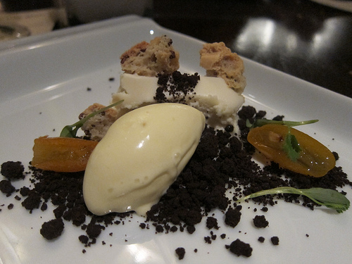 I was trying to save room for the dessert course, a lovely contrasting chocolate cardamon crumb cake with a beautifully light coconut clove bayleaf ice cream. And then I asked my friend about the cheese cart. Chef Laurent’s famous cheese cart- you can come to just enjoy that cart (starts at 4PM, dinner service starts at 5:30). Maybe one day I’ll do that. You can have every single cheese for $120. But we modestly got 3 ($12).