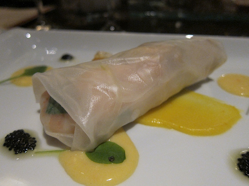 Next we had the Belizian shrimp spring roll with black mussels. It was plated with smoked dashi gelee, clementine miso curd, pickled celtuce, sweet potato, aji chiles and tobiko oil. I swirled my bites of spring roll around to get the full taste experience.