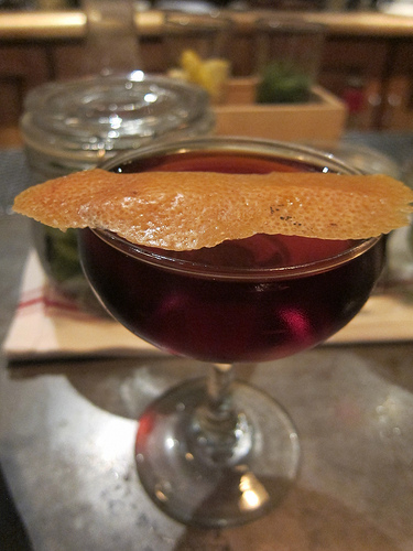 One of my new booze discoveries is Combier’s Pamplemousse Rose, a pamplemousse grapefruit liqueur that lends its name to the Modest Mousse (Espolon reposado tequila, Averna, Pamplemousse Rose, Punt e Mes, Angostura orange bitters, grapefruit oil). I love the band Modest Mouse and enjoyed the fun name of this drink.