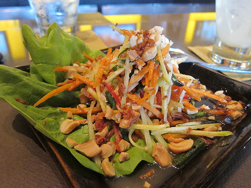 My friend ordered the veggie spring rolls (eggrolls) while I sprung for the green mango and papaya salad. Unfortunately, it was mostly a carrot salad and I’m not fond of the orange root vegetable. But for $4, I’m not going to quibble about it.