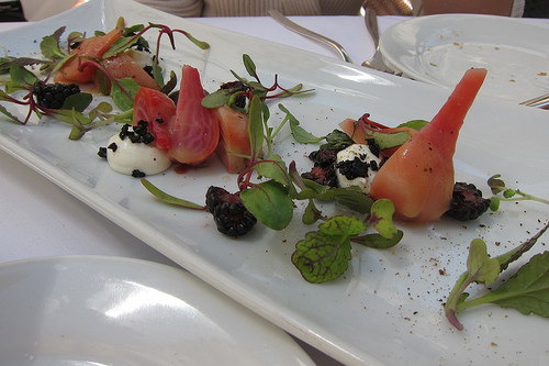 Think grilled cheese with some healthy veggies for the panini. Hey, mozarella is pretty low in fat (comparatively speaking). I did indeed like the striped bass. The fish was cooked perfectly and the bed of vegetables was excellent. I was really into the variously colored cauliflower, pureed broccoli and sauteed spinach. The spinach almost seemed like chips as they were a bit crispy. I liked this unusual texture for the spinach. Maybe spinach chips can replace kale chips as the next chip craze.
