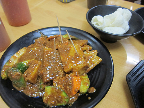 At first I was thinking of the gado gado (steamed veggies with peanut sauce) to compare to Simpang Asia’s but we ended up getting the rujak which was cucumber, jicama, pineapple and sweet potato topped with a shrimp paste peanut sauce. It’s not as weird as you think though I think our server thought we’d hate it. I actually liked the sauce best with the pineapple! The shrimp chips showed up with this dish and I approved of this because shrimp chips and hard-boiled eggs seem to be hallmarks of Indo cuisine– that and noodles.