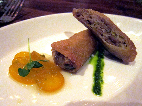 We tried the Jolly Pumpkin 3 AM bier and Asian Cowboy Sour (Death’s Door white whiskey, Cointreau, agave, Meyer lemon, purple basil, egg white) with the first dish, the crispy duck roll. With the slight sweet and sour flavor of the Asian-inspired dish, I thought both the beer and the cocktail went really well though being a booze nerd, I probably favored the cocktail more.