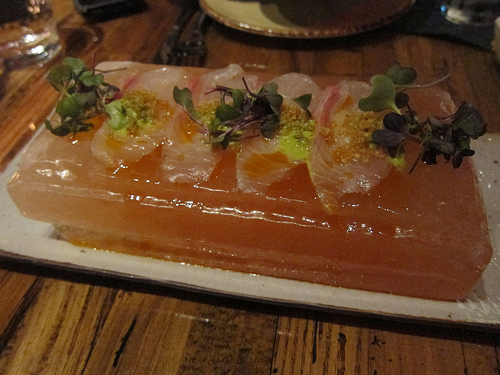 I love the wow factor of this kampachi tiradito served on a giant block of pink salt.