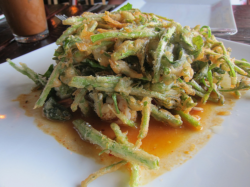 First we started with crispy morning glory. The lightly battered and fried hollow veggie stems were served with a piquant sauce and shrimp. It probably wasn’t the healthiest starter but it was delicious and made the surrounding tables jealous– and that’s what counts, right?