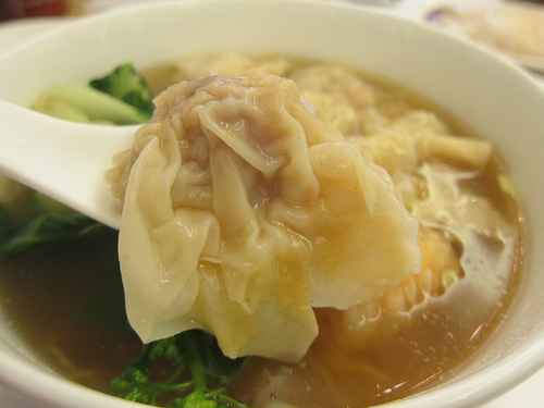 My favorite sort is a mix of pork and shrimp. The wrapper must be filled so it’s round with enough wrapper to trail around the soup bowl like “fins of a fish.” I also like really thin egg noodles with a great chew. I eat my wontons with red vinegar but lately started dabbing in a bit of chili oil.