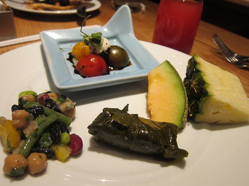 My recent Great American Roadtrip included a stop in Las Vegas. We had time to hit the buffets but which one? I was leaning towards going to Wicked Spoon but my friend convinced me to try Bacchanal at Caesar’s Palace. I was really impressed by the clean, updated decor and neatly laid out food. Quite a bit of it was already arranged for a single serving. It is all you can eat so of course you could try more but this way prompts less waste. Well, hopefully. I started out with a few brimming plates and struggled to finish my last plate sparsely decorated with one stuffed grapefleaf and a few other goodies.