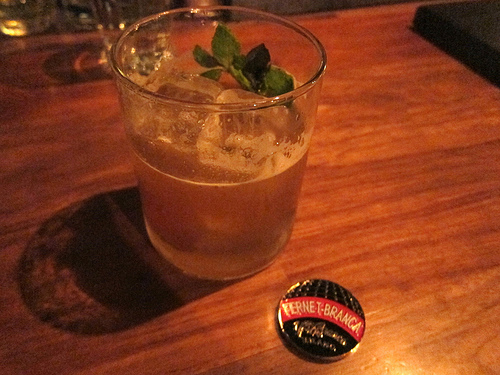 By this point in the night, my cell phone had died and I was trying to take a picture of my cocktail, the Shady Business with my Fernet-Branca challenge coin. The head bartender took one look at it and asked what bar I worked at. Ah! I knew I was definitely at a craft bar though the use of Fernet in a drink probably should have tipped me off. Later I would find out Proprietors LLC did the list.