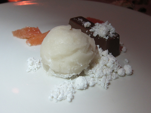 My favorite dessert was the Paloma, Chef Kyle’s take on the cocktail. Here the grapefruit is presented as powder, sorbet and in its natural fruit state. A little bit of chocolate rounds out the dish.